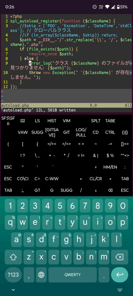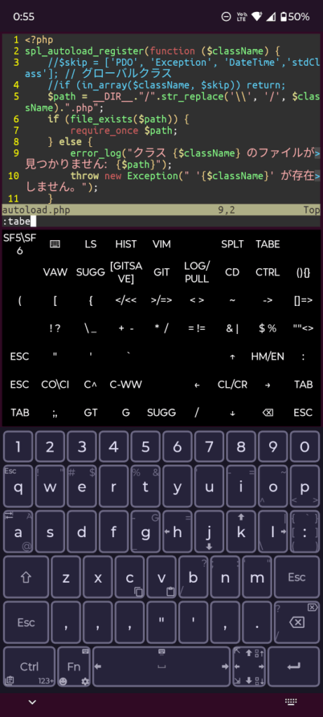 私はスマホというかAndroidデバイスでプログラミングなど文章を書く場合、termuxっていうアプリとそのうえで動くvimを使います。シェルの画面とソフトウェアキーボードの間に自由にカスタムキーが作れたりして便利なので、よく使うコマンドなんかをそのままキーにしています。